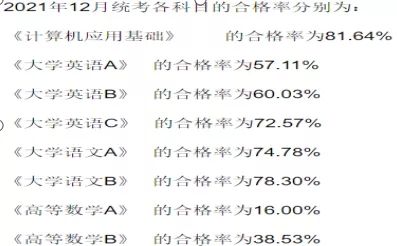 根据历年来的合格率看,其中计算机课程的合格率历年来都在80%左右,今年12月的合格率甚至达到了81.64%。